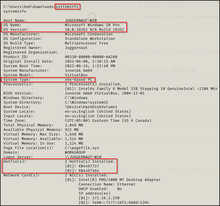 就像在上一篇文章中一样,我们首先要做的就是使用 systemInfo 命令查看系统的 操作系统版本、架构,以及最关键 HotFixes(KB) 等信息。