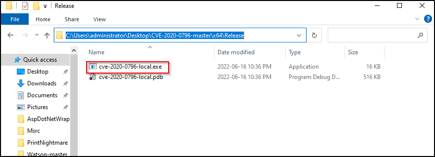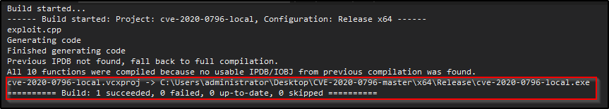 接下来,我们只需要将编译后的漏洞利用程序通过 SMB 共享传输到受害者机器,然后就可以开始利用了。