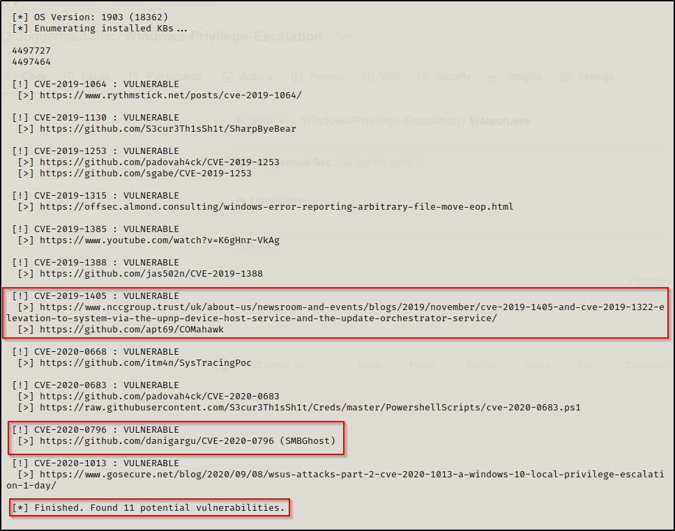 Watson(华生)是 sherlock.ps1 的继任者,它枚举了现代新版 Windows 系统的本地内核漏洞,它的工作内容和 Sherlock.ps1 对旧版 Windows 系统枚举内核漏洞所做的工作是一样的。
