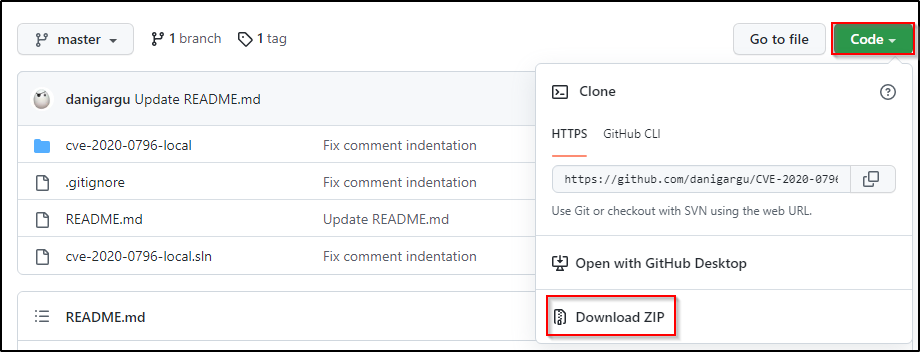首先,我们从 GitHub 获取 SMBGhost 漏洞的利用程序的源码文件,并将其解压缩。
