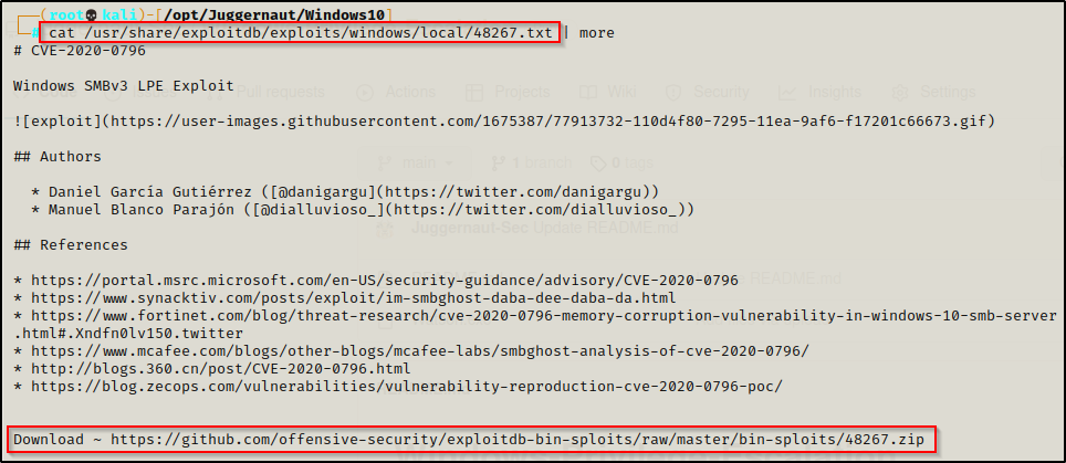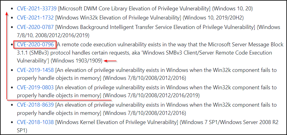 在 TXT 文件中,我们可以看到这是 CVE-2020-0796。这意味着这个漏洞比目标的最新补丁还要新,因此,应该可以利用这个漏洞提升到 SYSTEM。另外,漏洞利用的标题(Windows SMBv3 LPE Exploit)还显示了目标 SMB 的具体版本,而如果这个也可以和目标 SMB 版本相匹配的话,那就很有希望了。