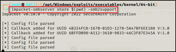 impacket-smbserver share $(pwd) -smb2support