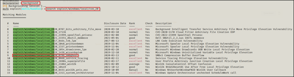 虽然有一些小遗憾,但它仍为我们测试漏洞利用提供了一个很好的起点。我们可以根据 Watson 扫描输出的信息,然后在 Metasploit 上测试出现的漏洞利用,如 CVE-2020-0668 和 SMBGhost。