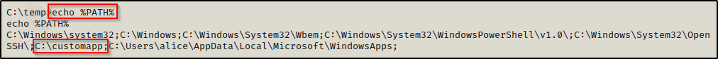BOOM!在这里,我们看到在 PATH 变量中存在一个不是系统默认目录的目录。更妙的是,该目录位于 C:\,这意味着我们应该有该目录的写入权限。