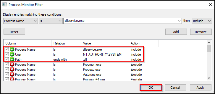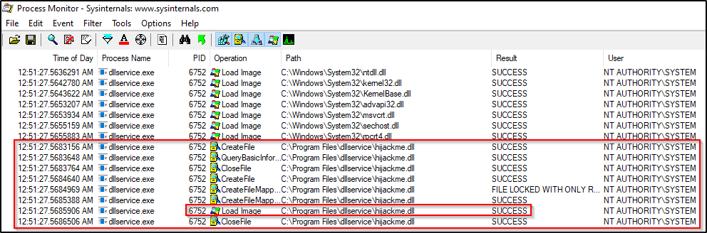 接下来,我们要做的就是利用服务获取 SYSTEM shell。不过,在此之前,我们先使用 Sysinternals 套件中的 Procmon 工具来深入分析一下 dllservice 进程,看一下该服务在启动时都发生了些什么。