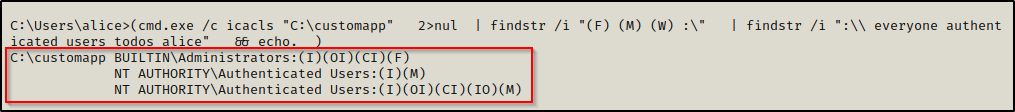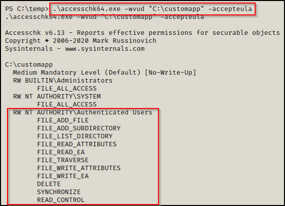 .\accesschk64.exe -wvud "C:\customapp" -accepteula