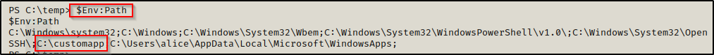 接下来,让我们回到普通用户 alice 的 PowerShell 会话,并使用以下命令检查 PATH 变量中包含的目录: