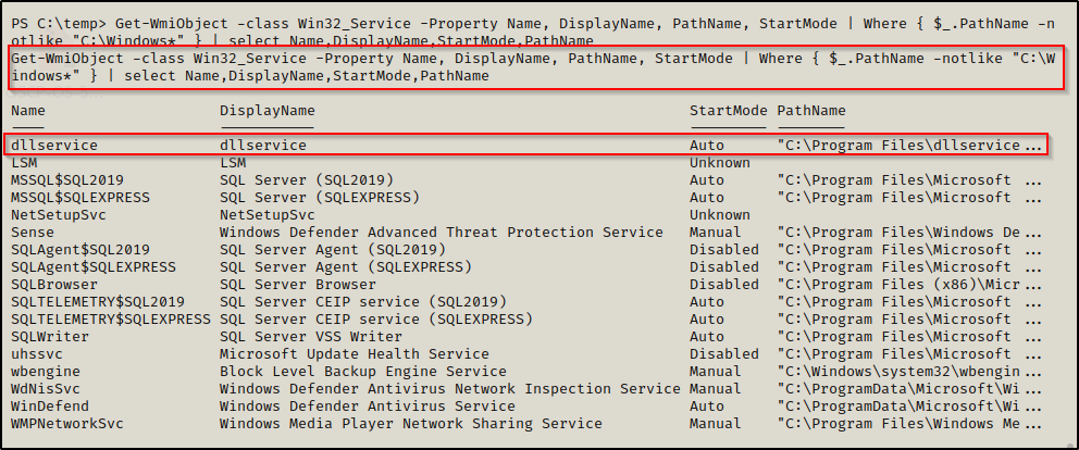 首先,我们需要找到一个非标准服务,可以使用以下 wmic 命令查询: