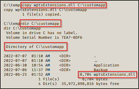 然后拷贝恶意 DLL 到 C:\customapp 目录下,并重命名为 wptsExtensions.dll。