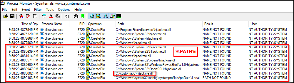 这一次,当停止并启动服务时,我们会发现 hijackme.dll 会首先尝试从应用程序目录中加载。一旦找不到 DLL,它就会按照预定义的搜索顺序执行。一旦通过 C:\Windows\* 等目录,它就会开始检查 PATH 变量,并尝试从 C:\customapp 加载 DLL。
