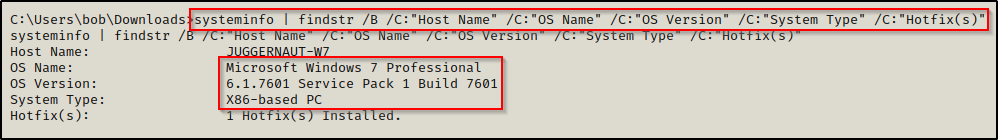 systeminfo | findstr /B /C:"Host Name" /C:"OS Name" /C:"OS Version" /C:"System Type" /C:"Hotfix(s)"
