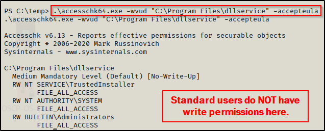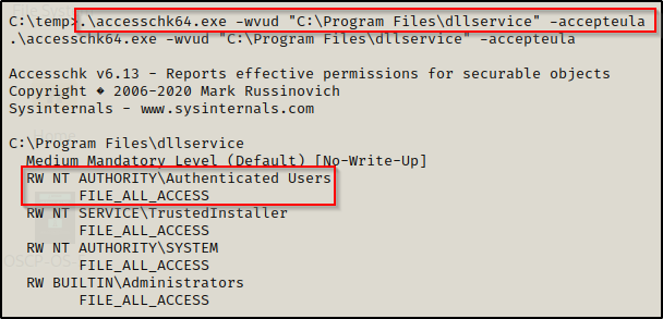 .\accesschk64.exe -wvud "C:\Program Files\dllservice" -accepteula