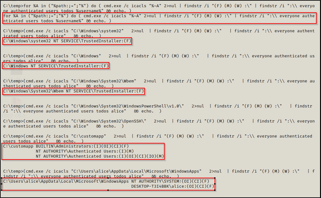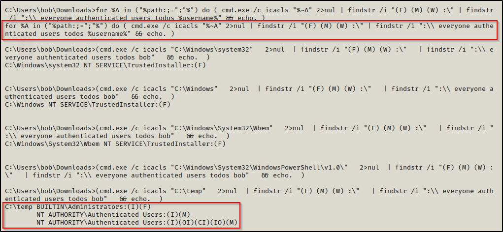 如我们所料,我们可以在该目录中进行写入操作!此外,我们还可以使用 for 循环,配合 icacls 来快速遍历 PATH 变量中每个目录的权限情况。