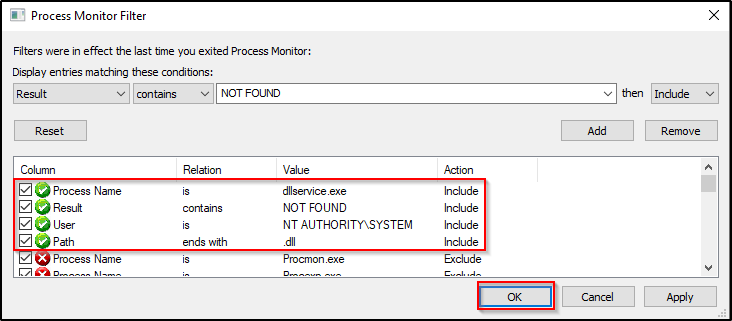 为了能更直观地理解这一点,我们将返回管理员 GUI 界面,并再次运行 Procmon。但这次,我们将添加一个过滤器,以查看程序是如何处理丢失的 DLL。