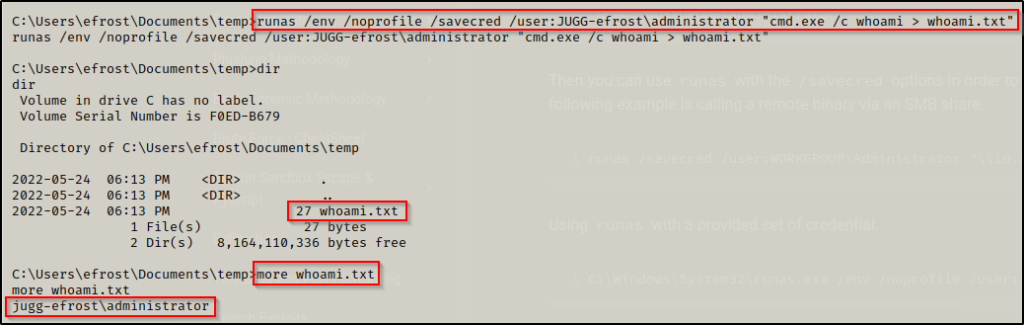 runas /env /noprofile /savecred /user:JUGG-efrost\administrator "cmd.exe /c whoami > whoami.txt"