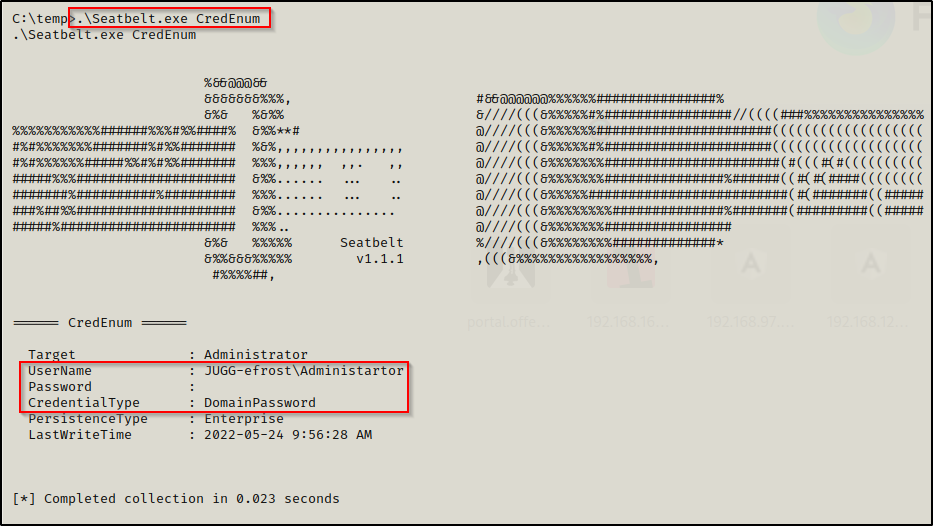 但是,我的确很想展示怎样通过工具来枚举存储的凭据,因此让我们来看一下 Seatbelt.exe 的表现吧。