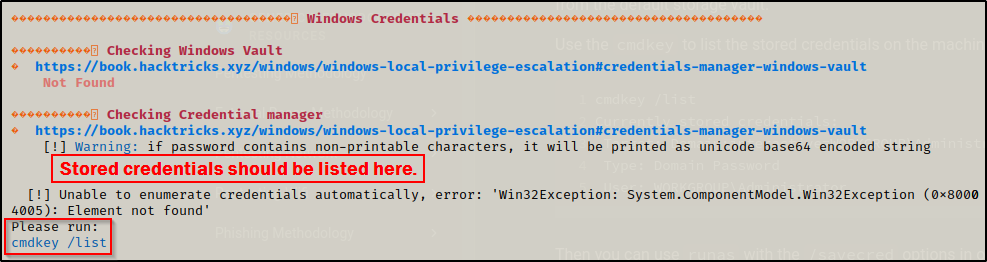 从输出中可以看到,winPEAS 使用的方法与我们手动枚举的方法相同。它提示我们在 winPEAS 失败后可以使用 cmdkey /list 来枚举此内容。