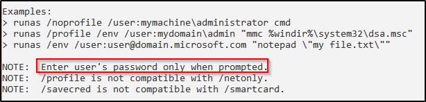 现在 Windows 去掉了 runas 命令中对密码参数的支持,更改为需要与用户交互来请求密码的方式。此外,我们也不能通过使用 echo-pipe 技巧将密码通过管道传输到命令来绕过这一点。
