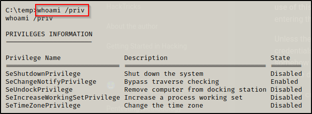 但是,当使用 whoami /priv 检查我们的权限时,会发现此时处于中完整性 shell 中,并且没有管理权限。