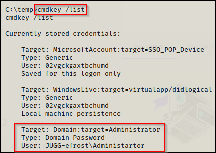 runas /env /noprofile /savecred /user:JUGG-efrost\administrator cmd