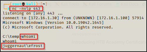 在此示例中,假设我们在 FTP 服务器中找到了敏感信息,然后以用户 efrost 的身份在 Windows 10 目标上获得了立足点。