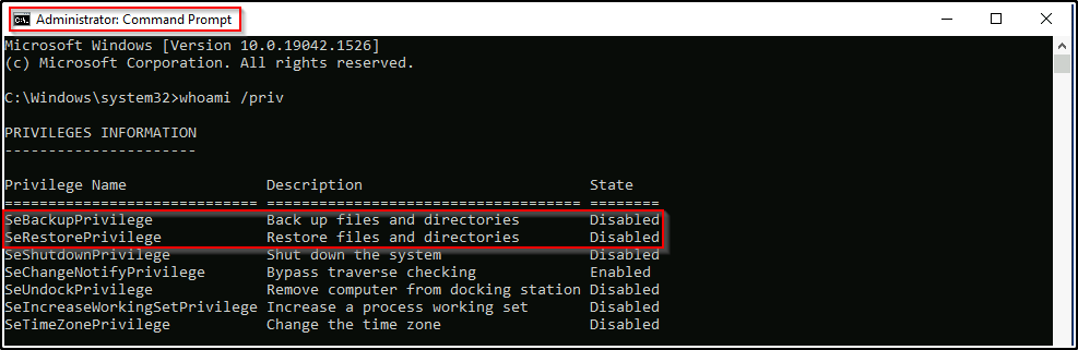 登录之后,使用 whoami /priv 命令快速检查一下当前账户的权限,我们看到它确实启用了 SeBackupPrivilege 特权。