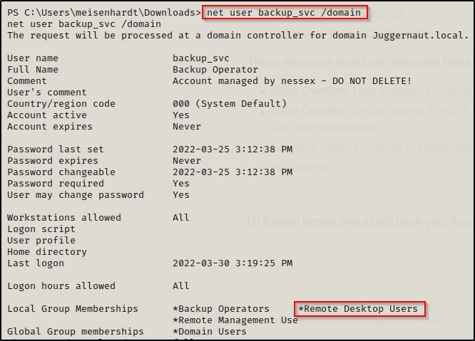 从示例场景出发,假设我们是在 Windows 10 主机上获得了一个 efrost 的普通域用户身份的立足点,而不是在备份服务器上。再假设当我们进行域枚举时,发现 backup_svc 用户也是远程桌面用户(Remote Desktop Users)组的一员。