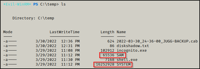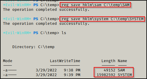 现在我们有了 SeBackupPrivilege 特权,便可以像之前一样从注册表提取 SAM/SYSTEM 文件副本了。