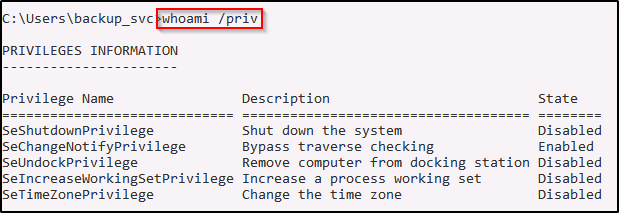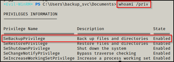我们知道 backup_svc 账户在备份操作员组中,但是,当我们使用 whoami /priv 时,我们却并没有看到 SeBackupPrivilege 特权。