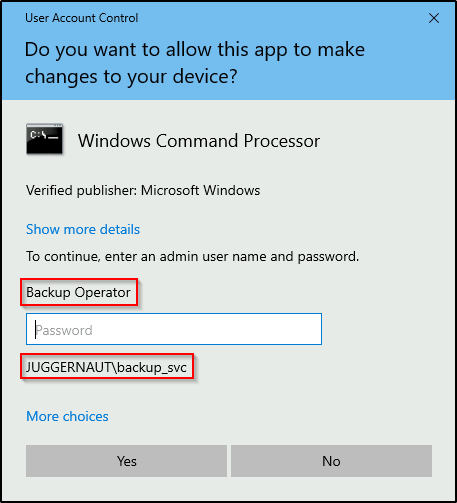 这是因为:在低完整性的 shell 环境中,SeBackupPrivilege 这项特权默认是未开启的。而若要开启该特权,您需要通过“以管理员身份运行”来打开 cmd,这时会弹出一个 UAC 提示框,要求输入当前用户的密码,而这就是 Windows 对备份操作员组中的用户权限的处理方式。