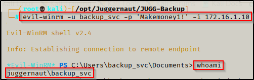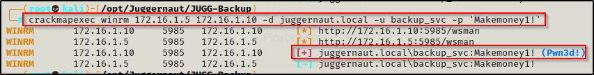 crackmapexec winrm 172.16.1.5 172.16.1.10 -d juggernaut.local -u backup_svc -p 'Makemoney1!'