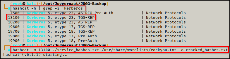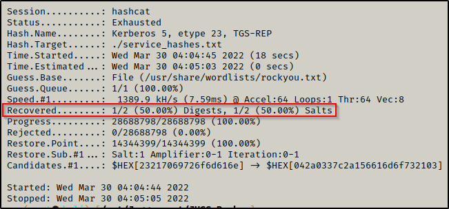 hashcat -m 13100 ./service_hashes.txt /usr/share/wordlists/rockyou.txt -o cracked_hashes.txt