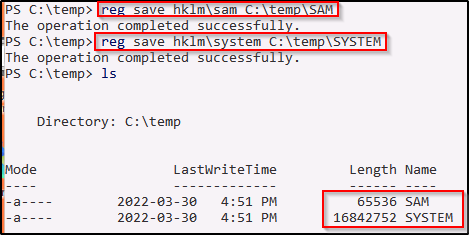 使用以下命令,我们可以从注册表中提取 SAM\SYSTEM 文件的副本: