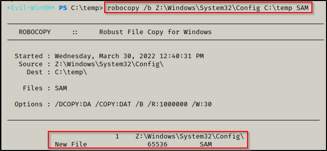 robocopy /b Z:\Windows\System32\Config C:\temp SAM