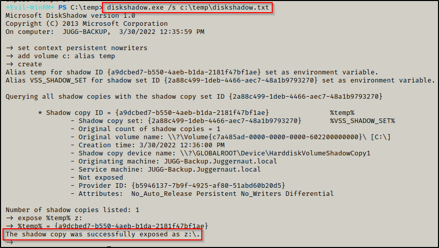 diskshadow.exe /s c:\temp\diskshadow.txt