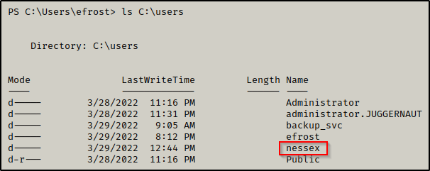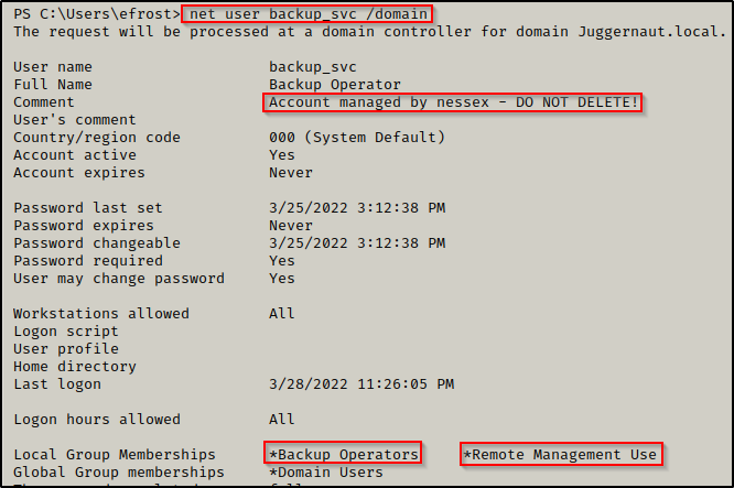- (2)帐户 backup_svc 位于备份操作员组(Backup Operators)中,这意味着它具有 SeBackupPrivilege 特权。同时该帐户也位于远程管理用户组(Remote Management Users )中,由用户 nessex 管理。